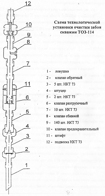 Установка включает в себя ловушку 1, соединенную с обратным клапаном 2, затем через 5 шт. насосно-компрессорных труб (НКТ) 73 (поз. 3) монтируются штуцер 4, через 2 шт. НКТ73 (поз. 5) разгрузочный клапан 6, далее через 10 шт. НКТ73 (поз. 7) сбивной клапан 8 и через 140 шт. НКТ73 (поз. 9) предохранительный клапан 10, последний крепится к подвеске НКТ73 (поз. 12). Часть установки между разгрузочным клапаном 6 и предохранительным клапаном 10 образует герметичную рабочую камеру, в которой находится воздух под атмосферным давлением.